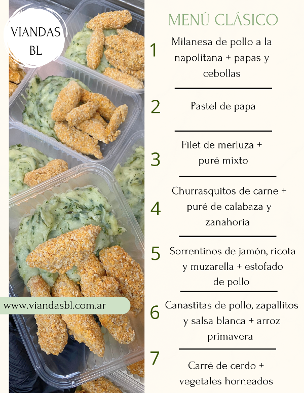Las viandas se entregan congeladas, en bandejas aptas freezer y microondas. Duran hasta 2 meses a partir de su fecha de elaboración.